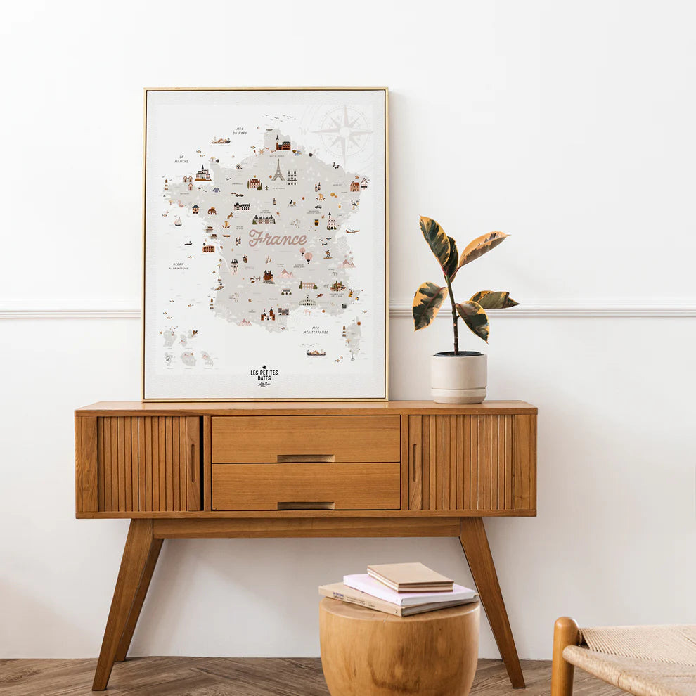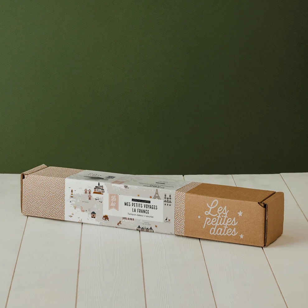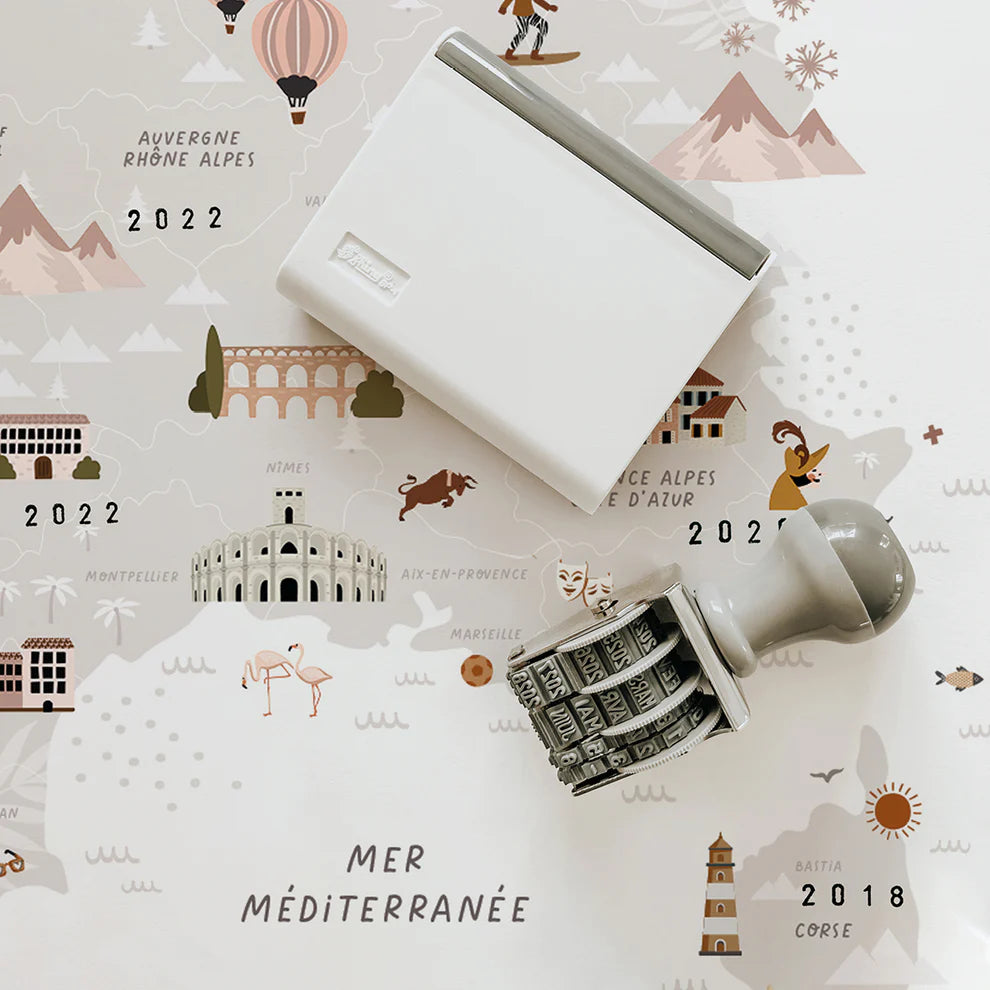 Des villages pittoresques aux sites emblématiques, cette affiche vous invite à tamponner chaque destination visitée : la Tour Eiffel, le Mont Saint-Michel, les champs de lavande en Provence, Deauville et son festival, et bien plus encore.